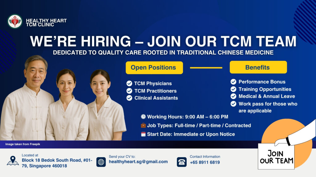 At Healthy Heart PTE. LTD., we are dedicated to helping our community achieve wellness through the authentic principles of Traditional Chinese Medicine. We’re currently looking for a licensed and compassionate TCM Practitioner to provide high-quality care through treatments such as Tuina, cupping, and other traditional techniques.